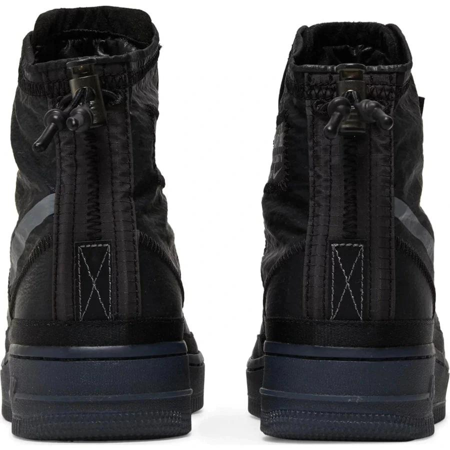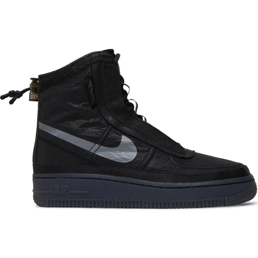 The Nike AF1 Shell "Triple Black" is a modern and sleek take on the iconic Air Force 1 silhouette. The shoe is designed with an all-black colorway, which gives it a classic and versatile look that can match with many outfits. The upper is constructed with synthetic leather and mesh materials, which makes it durable and breathable at the same time. The shoe also features a rubberized and textured shell toe, which offers added protection and durability. The Nike Swoosh is made of black leather and is present on both sides of the shoe. The flat black laces blend in seamlessly with the all-black upper, while the mesh tongue and Nike branding tag provide a breathable and comfortable fit. The heel tab is also black and features an embossed Nike logo. The midsole of the shoe is made of white foam and features visible Nike Air cushioning, which provides comfort and support with every step. The outsole is made of durable black rubber with a traction pattern that offers grip and stability on various surfaces.