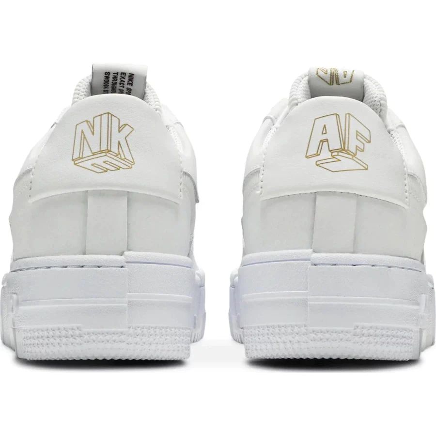 The Nike Air Force 1 Pixel Grey Gold Chain is a women's sneaker from Nike's Air Force 1 collection. It features a unique and stylish design, with a chunky sole and a low-top silhouette. The upper is made of grey leather, with perforations on the toe box for ventilation. The shoe also has a gold chain detail on the heel, adding a touch of luxury to the design. The midsole is elevated and made of foam, with a textured outsole for grip. The shoe also has a lace-up closure with tonal laces, and Nike branding on the tongue and insole.