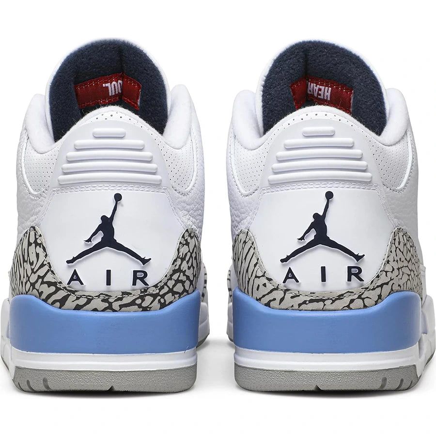 The Air Jordan 3 True Blue is a classic sneaker that features a timeless design and excellent performance features. The upper of the shoe is made of white tumbled leather, with elephant print overlays on the toe cap and heel. The accents on the shoe are blue, including the Jumpman logo on the tongue and the Jumpman logo on the heel. The colorway of the shoe is primarily white with blue and grey accents, making it a versatile sneaker that can be paired with a variety of outfits. The midsole of the Air Jordan 3 True Blue is made of lightweight foam material with a visible Air-Sole unit in the heel for cushioning and impact protection. The midsole is white in color and provides excellent support and comfort for the foot. The outsole of the shoe is made of rubber and features a herringbone pattern for traction and durability. The color of the outsole is blue with a grey rubber sole. The interior of the shoe is lined with a breathable textile material that provides comfort and ventilation for the foot. The insole of the shoe is made of a cushioned foam material and features a Jumpman logo on the heel.